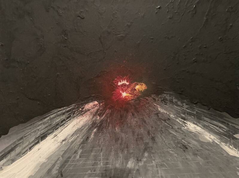 This was created to express the feelings of PTSD. Not just the idea of the individual being Unforgiven, but the ability for the individual to forgive others. What you do day to day effects everyone differently, think about how your actions affect others, especially the little things. Why is that person who cut you off alive when others who sacrificed their life for the greater good are not alive? What will you do with this one life you have, day-to-day in the little interactions. I see my husband deal with these thoughts and wanted to express my interpretation of this idea. A hot sort of tunnel feeling, explosions in the shapeless darkness. Acrylic on canvas, very stylized version of a photo taken in Cochranville PA.